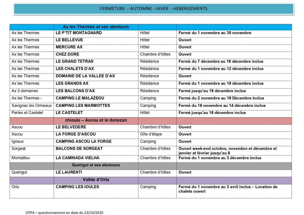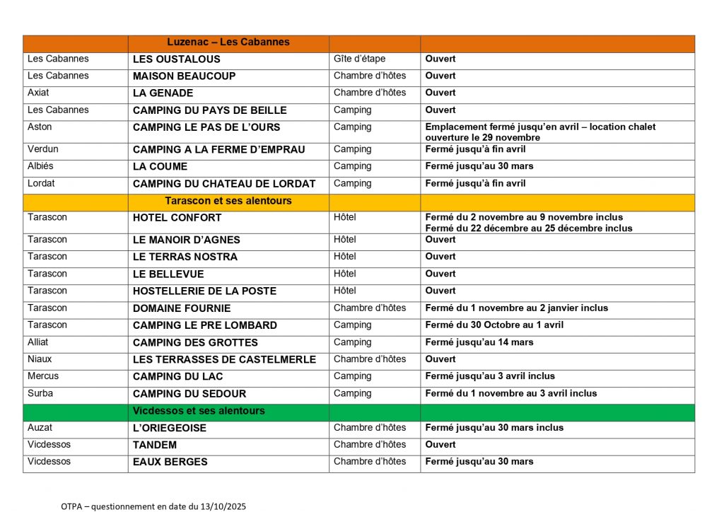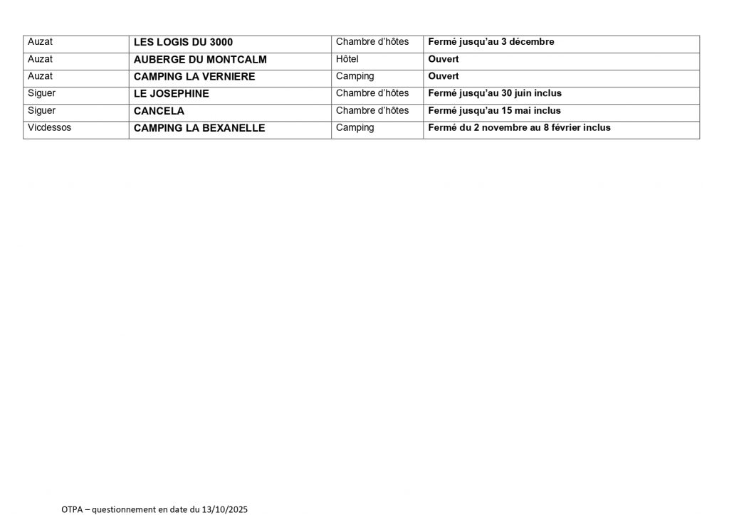 Ouverture/Fermeture saisonnière des hébergements professionnels partenaires
