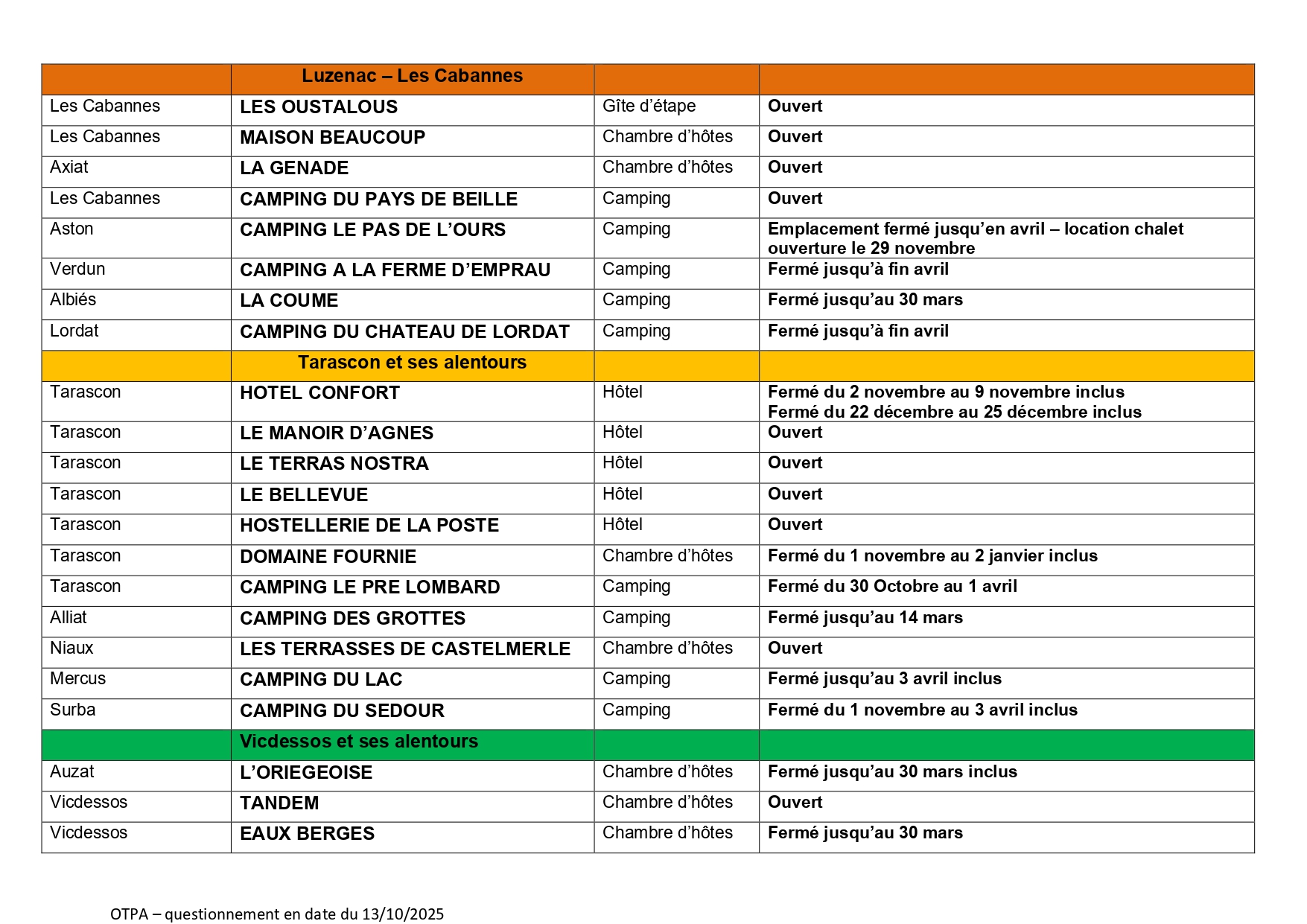 Ouverture/Fermeture saisonnière des hébergements professionnels partenaires