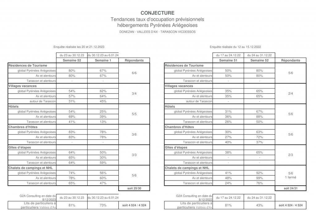 Conjecture – Taux d’occupation prévisionnels du 23 décembre 2023 au 6 janvier 2024